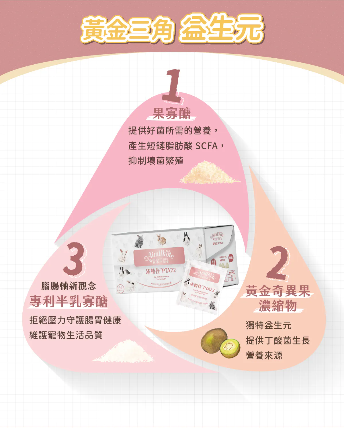愛米可緹®獨家研發專利,耗時四年,從兔兔盲腸便篩選出來,專為草食寵物設計的益生菌,幫助維持消化道機能。